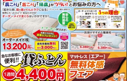 オーダーメイド枕・エアー・整圧敷布団・羽毛布団・わたの打ち直し・水洗いクリーニング・貸し布団